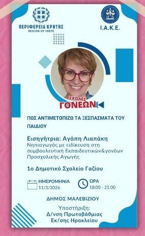 Εισηγήτρια: Αγάπη Λιαπάκη, Νηπιαγωγός με ειδίκευση στη συμβουλευτική γονέων και εκπαιδευτικών πρωτοβάθμιας εκπαίδευσης.